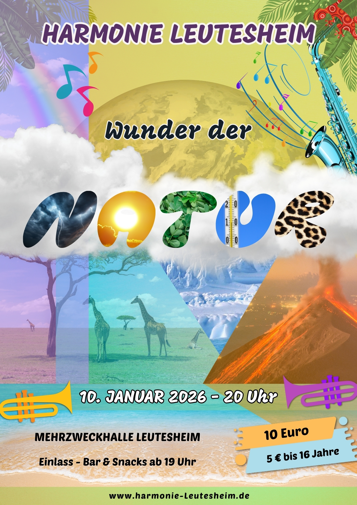 Am Samstag, 10. Januar, lädt der Musikverein „Harmonie“ Leutesheim e.V. herzlich zum Jahreskonzert in die Mehrzweckhalle Leutesheim ein. Unter dem Motto „Wunder der Natur“ trotzen die Musiker jeglichen Wetterkapriolen und nehmen das Publikum mit in die klangvolle Welt von Regen, Wind, Schnee, Sturm und Sonnenschein.