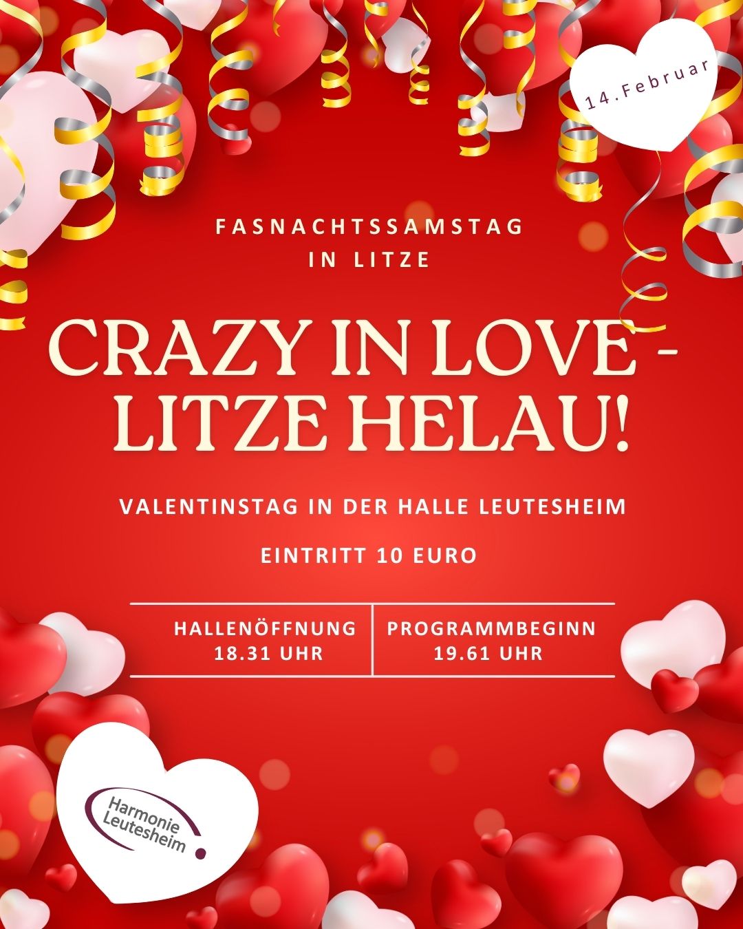 Ob verliebt, verlobt, verheiratet oder … „loss mech bloos enn roij met denne Wiewwer / Karrel!" - Feiert mit uns den närrischen Valentinstag am Fastnachtssamstag in der Leutesheimer Halle! In diesem Jahr wird es besonders romantisch. Wir spielen Amor und versüßen unseren Gästen mit den Valentinstag mit vielen Leckerbissen für Augen, Ohren und Lachmuskeln.